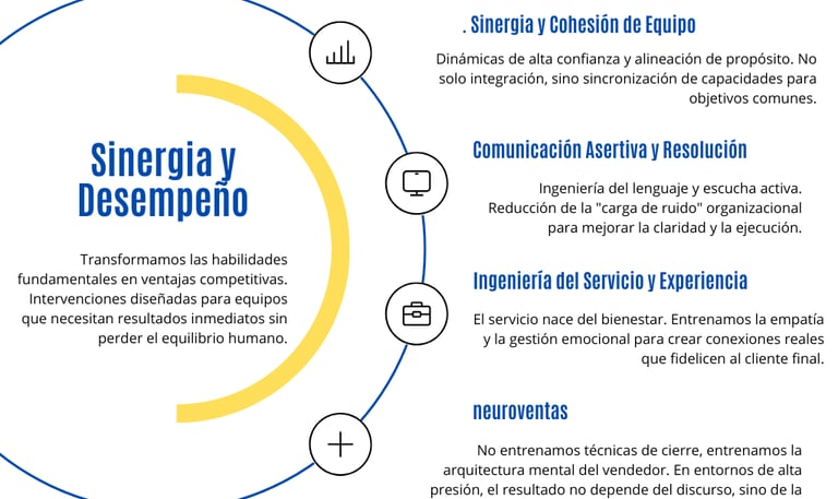 Transformamos las habilidades fundamentales en ventajas competitivas. Intervenciones diseñadas para equipos que necesitan resultados inmediatos sin perder el equilibrio humano.